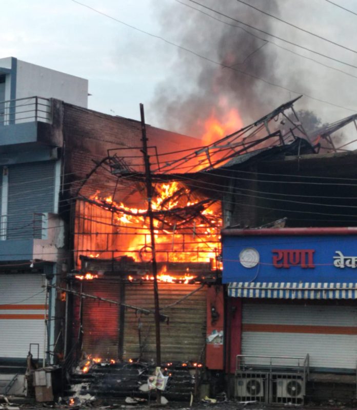 शहरातील डॉक्टर बाबासाहेब आंबेडकर चौकामधील नाव लौकिक असलेले राधेय कोल्ड्रिंक्स या प्रतिष्ठानला आज दिनांक 12 मे रोजी पहाटे चार ते साडेचार च्या दरम्यान सोलर पॅनल च्या शॉर्टसर्किटमुळे भीषण आग लागली या आगीमुळे प्रतिष्ठानचे करोडोचे नुकसान झाल्याची प्राथमिक माहिती असून संपूर्ण दुकान जळून खाक झाले आहे. तर इतर प्रतिष्ठानलाही हानी पोहोचली आहे.याबाबत माहिती अशी की पहाटे चार साडेचार च्या दरम्यान ही आग स्थानिक नागरिकांना दिसून आली.पोलीस स्टेशनला लागूनच असलेल्या प्रतिष्ठान मध्ये आग लागल्यामुळे पोलीस स्टेशनचे ड्युुटीवरील सर्व पोलीस कर्मचारी सुद्धा या ठिकाणी धावत आले तात्काळ जळगाव नगरपालिकेच्या अग्निशमन दलाला प्रचारण करण्यात आले परंतु टँकर मध्ये पाणी कमी असल्यामुळे तेवढे पाणी मारून पुन्हा टँकर पाण्यासाठी गेला त्यामुळे आगीने रौर्द रूप धारण केल्याचे यावेळी दिसून आले. यावेळी स्थानिक पोलिसांनी व नगर परिषद प्रशासनाने मलकापूर व शेगाव येथील अग्निशामक दलाला या ठिकाणी बोलाविण्यात आले होते. त्यानंतर तिन्ही गाड्यांनी मिळून या आगीवर नियंत्रण मिळविले. पहाटेची वेळ असल्याने कुठलीही जीवित हानी झाली नाही तसेच हवा आणि वादळ नसल्यामुळे इतरत्र आगीचा विस्तार झाला नाही. परंतु संपूर्ण दुकान माला सह सोलर,फर्निचर,डीप फ्रिजर या सारख्या वस्तू जळल्याने खूप मोठे आर्थिक नुकसान झाले. हे नुकसान कोटीमध्ये असू शकते असा अंदाज साधारणता दुकानात असलेल्या संपूर्ण बनवटी नुसार व दुकानातील माल ह्यावरून काढता येतो,