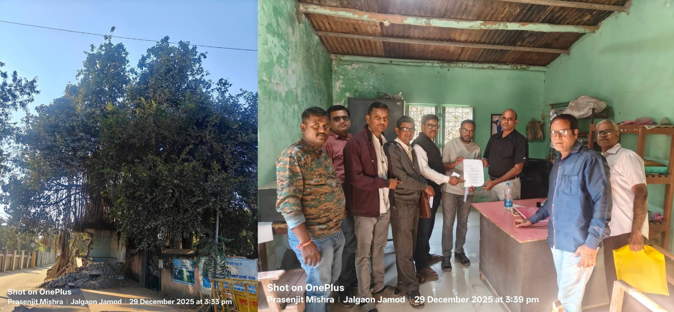 निवेदन दिले जळगांव जामोद येथील एसडीओ कार्यालयाच्या जवळ सध्या सुरु असलेल्या बांधकामाच्या परिसारात जुन्या उपविभागीय अधिकारी कार्यलयाच्या बाजूला जुने सेतू असणारे दुकान पाडण्याचे काम सध्या सुरु आहे त्या ठिकाणी एक अंत्यत प्राचिन, शेकडो वर्ष जुना वड वृक्ष उभा आहे हा वृक्ष केवळ एक झाड नसुन अनेक पिढंयाचा साक्षीदार असून, परिसराच्या पर्यावरणीय समतोलाचा एक महत्वाचा आधार आहे.