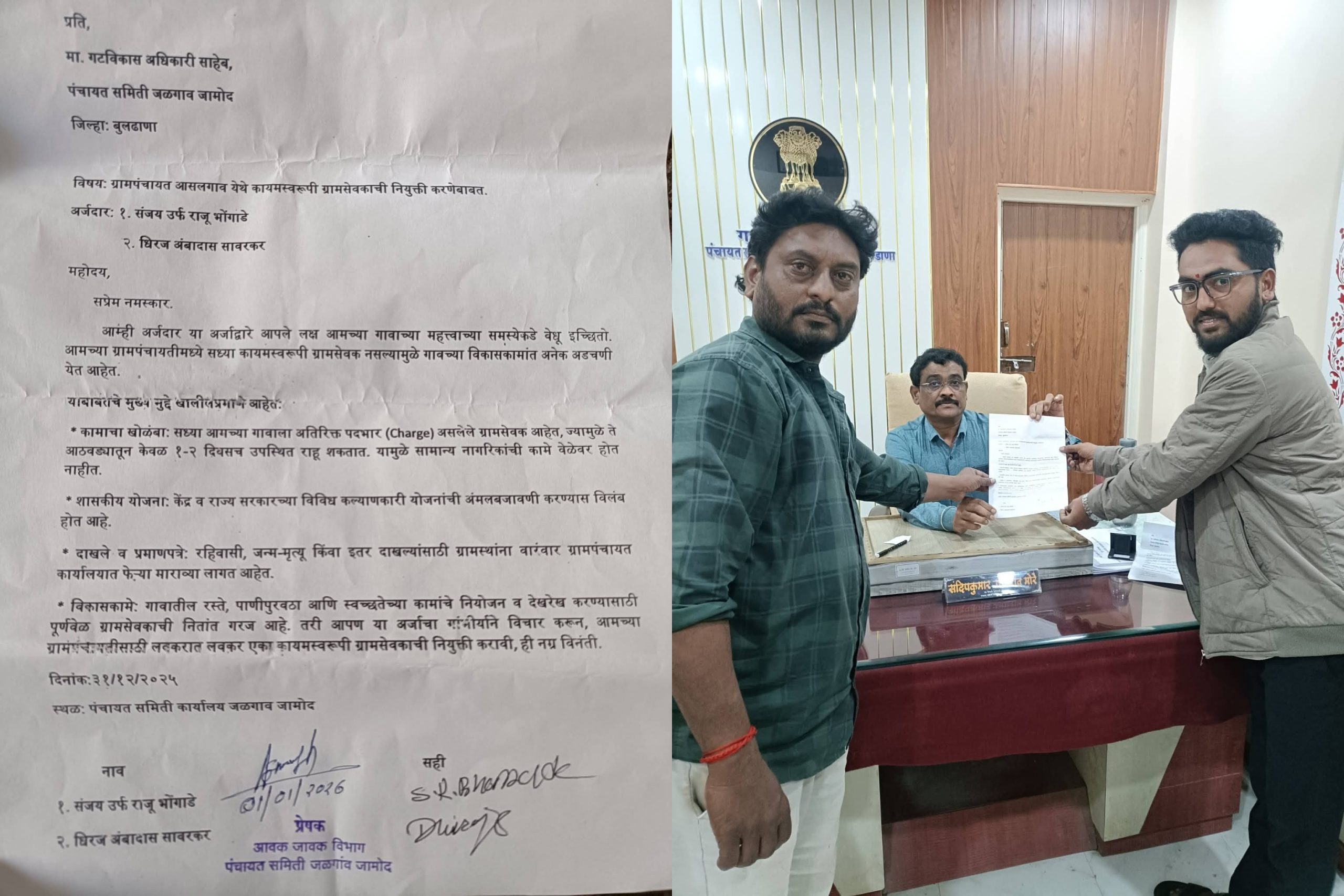 स्थानिक पंचायत समिती प्रशासनाने या अर्जाची गांभीर्याने दखल घेऊन आसलगावसाठी तातडीने कायमस्वरूपी ग्रामसेवकाची नियुक्ती करावी, अन्यथा लोकशाही मार्गाने आंदोलन करण्याचा इशाराही गटविकास अधिकारी पंचायत समिती जळगाव जामोद यांना दिला आहे.