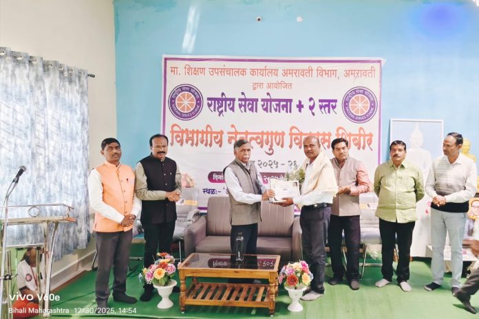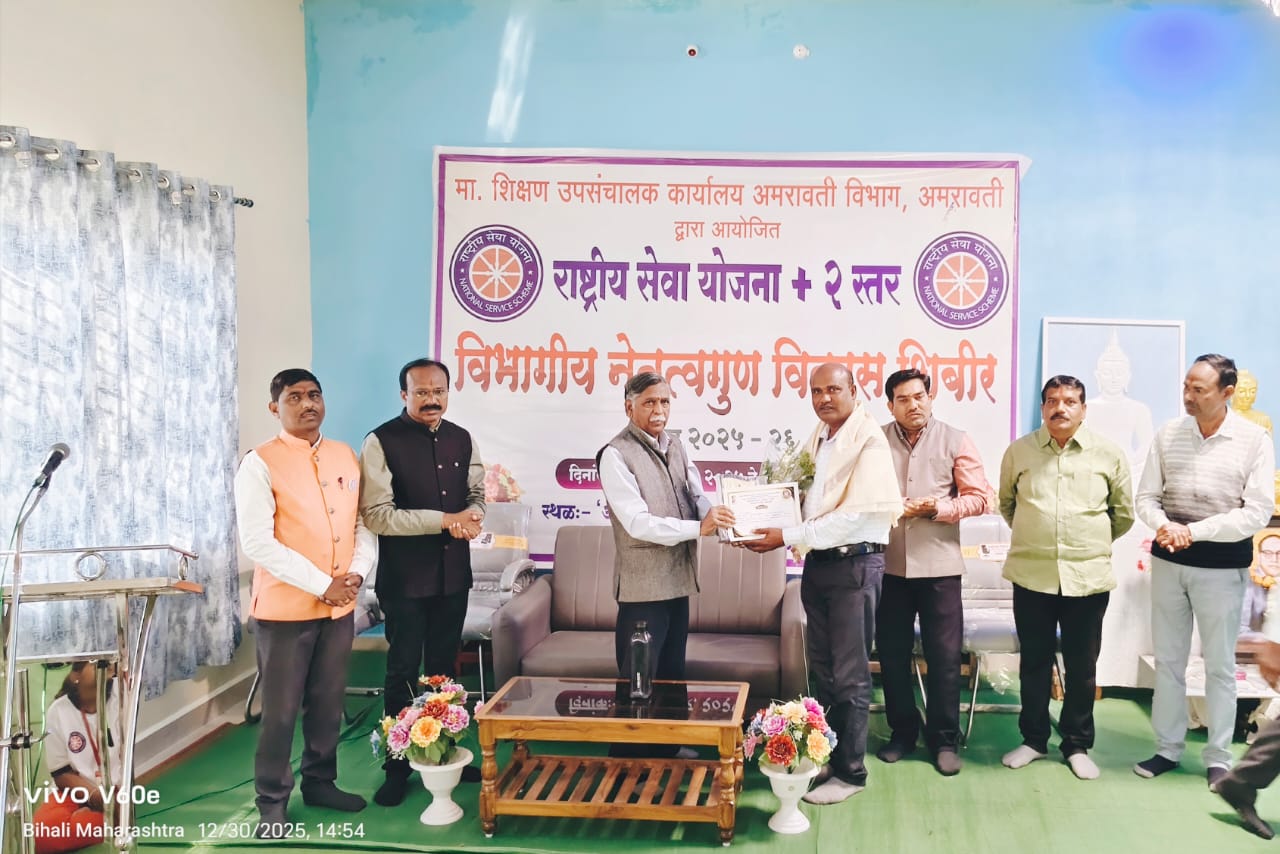 शिक्षण उपसंचालक कार्यालय अमरावती विभाग अमरावती द्वारा आयोजित राष्ट्रीय सेवा योजना + 2 स्तर चे विभागीय नेतृत्व गुणविकास शिबिर बिहाली ता. चिखलदरा जि.अमरावती येथे पार पडले या शिबिरामध्ये आदर्श कार्यक्रम अधिकारी पुरस्कारांचे वितरण करण्यात आले. बुलढाणा जिल्ह्यामधून महात्मा फुले कनिष्ठ महाविद्यालय खेर्डा ता. जळगाव (जामोद) जि.बुलढाणा येथील प्रा.संतोष जाधव यांना राष्ट्रीय सेवा योजना आदर्श कार्यक्रम अधिकारी पुरस्कार 2024 -2025 प्रदान करण्यात आला.
