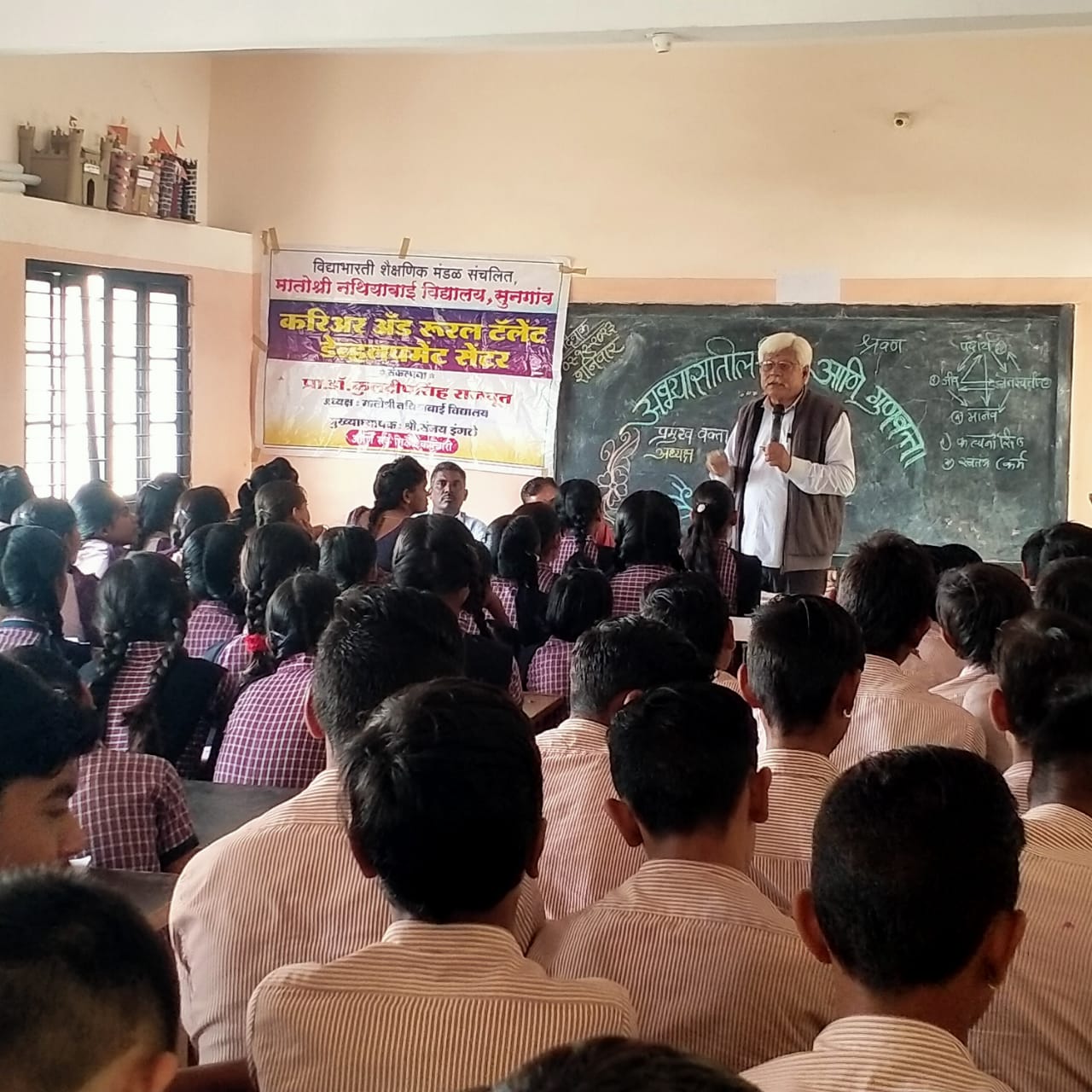 सुनगांव येथील मातोश्री नाथियाबाई विद्यालय आणि इंग्लिश मिडीयम स्कूल येथे, ‘करिअर अँड रूरल टॅलेंट डेव्हलोपमेंट सेंटर’ अंतर्गत ‘अभ्यासातील शिस्त आणि गुणवत्ता’ या विषयावर माजी गटशिक्षणाधिकारी, केंद्रप्रमुख मधुकर ढोले यांचे मार्गदर्शन सत्र आयोजित करण्यात आले. ढोले यांनी शालेय जीवनात शिस्तीचे महत्व, शिक्षणाचा अर्थ आणि हेतू, गुणवत्तापूर्ण अभ्यास याविषयी व्याख्यान दिले. ढोले यांनी गुणवत्तेचे समीकरण मांडत क्षमता आणि प्रभुत्व का आवश्यक आहे याची चर्चा केली. प्रश्नोत्तराच्या माध्यमाने विद्यार्थ्यांनी सक्रिय सहभाग घेतला. मार्गदर्शन सत्रासाठी अनेक पालकांनीही उपस्थिती लावली होती. शाळेचे मुख्याध्यापक संजय इंगळे यांनी अध्यक्षीय भाषण केले. एकनाथ अढाव, कु. ज्योती खवले आणि कु. मनीषा बाणाईत यांनी समन्वय म्हणून जबाबदारी पार पाडली. सुनगांव सारख्या अती ग्रामीण भागातील विद्यार्थ्यांना शालेय जीवनातच करिअर मार्गदर्शन मिळावे यासाठी या मातोश्री नाथियाबाई विद्यालयाचे अध्यक्ष प्रा. डॉ. कुलदीपसिंह दर्यावसिंह राजपूत यांनी ‘करिअर अँड रुरल टॅलेंट डेव्हलपमेंट सेंटर’ ची सुरुवात शाळेमध्ये केली आहे.