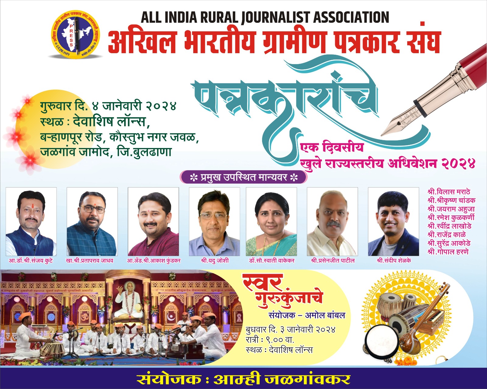 अखिल भारतीय ग्रामीण पत्रकार संघाचे एकदिवसीय खुले राज्यस्तरीय अधिवेशन गुरुवार ४ जानेवारी २०२४ रोजी जळगांव (जामोद) येथील बऱ्हाणपूर रोडवर असलेल्या देवाशिष लॉन्स येथे आयोजित केले आहे. या अधिवेशनाचे आयोजक अखिल भारतीय ग्रामीण पत्रकार संघ (भारत) असुन संयोजक आम्ही जळगांवकर पत्रकार आहे.